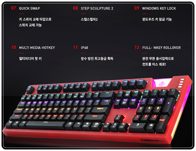 이중사출 키캡으로 반 영구적인 상태로 보존이 가능하고 LED 투광효과가 뛰어납니다.