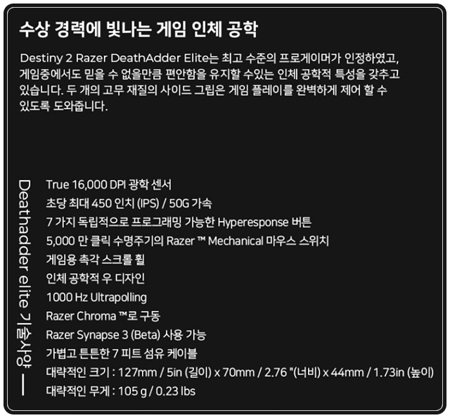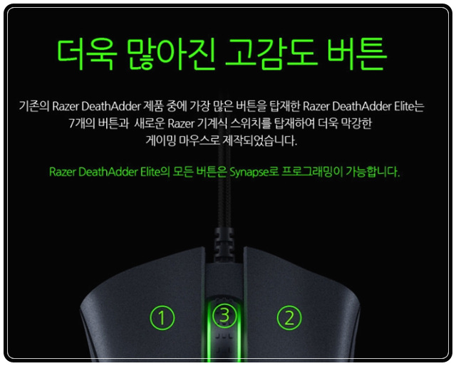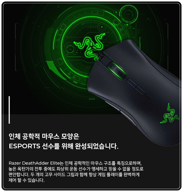 레이저의 베스트셀러이자 주력인 마우스 라인업이 '레이저 데스에더'입니다. 흔히들 데스에더 왕조라고 부를만큼 그 명성이 자자한데요, 그 중에서 가성비가 최강이라고 호평받고 있는 제품이 바로 이 '레이저 데스에더 엘리트'입니다.