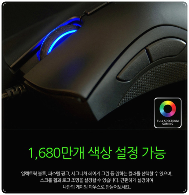 그렇게 됨으로써 전반적인 사양이 좋은 상당히 저렴한 게임용 마우스가 되었습니다. 7개의 프로그래밍 가능한 버튼, 2개의 Razer Chroma 조명 영역, 16000개의 높은 최대 DPI 등 상당히 뛰어난 기능을 많이 가지고 있습니다.